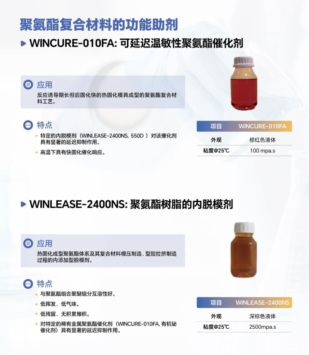 其中公司自主研发的两款有望实现进口替代的应用于拉挤成型聚氨酯树脂中的可延迟性催化剂以及具有常温催化抑制性的内脱模剂在展会上颇受瞩目。