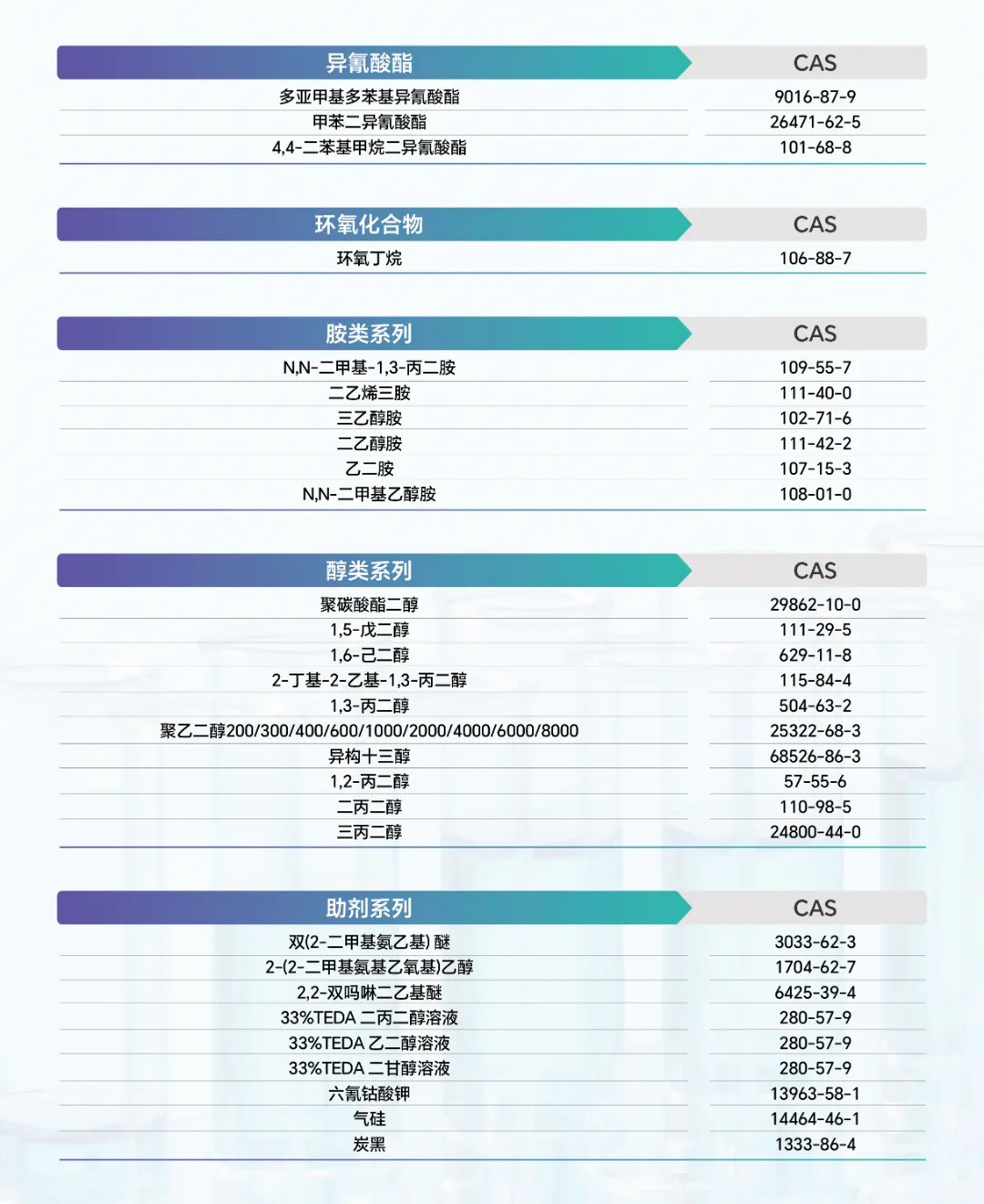 产品广泛应用于制造新能源风、光发电领域的高强度复合材料、公用工程和交通运输领域的结构胶黏合剂与弹性体、医疗护理及休闲运动领域的超柔粘弹性凝胶材料、以及精密电子仪器件的封装保护。