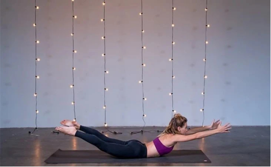 05蝗虫式:俯卧在垫面上,吸气,双手前平举,呼气,抬起双腿,同时抬起头部,双手臂向前伸展,保持3-5分钟。