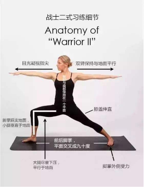06战士二式:1、山式站立,收腹,双脚压实垫面,下颚微收,骨盆摆正,胸腔和双肩打开;2、吸气,双脚打开大于一条腿长的距离,右侧打开90度,左脚尖指向正前方,双手放于腹轮处;3、呼气,抬起手臂与肩膀同高,弯曲右膝到膝盖在脚踝的正上方,大小腿成90度,手臂,肩膀成一条直线,保持3-5组深长的呼吸,换另一侧练习。