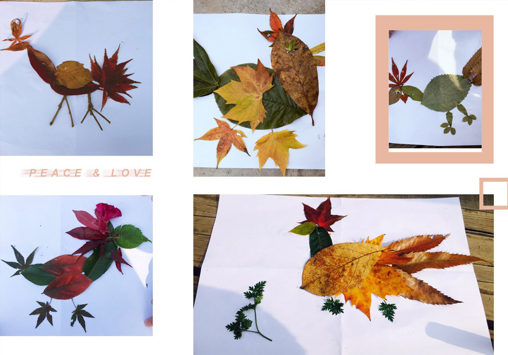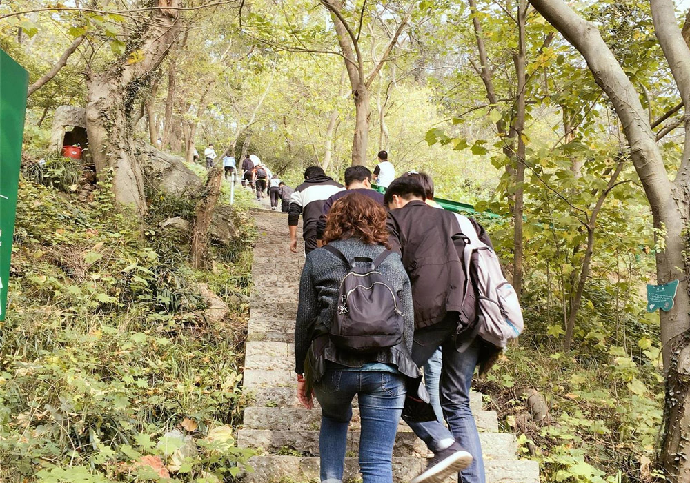 首先,第一个拓展游戏是分组爬山拼图比赛。在爬山的过程中捡树叶等全员到达山顶之后用树叶拼出指定图案。