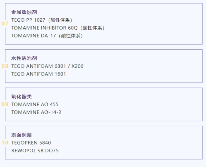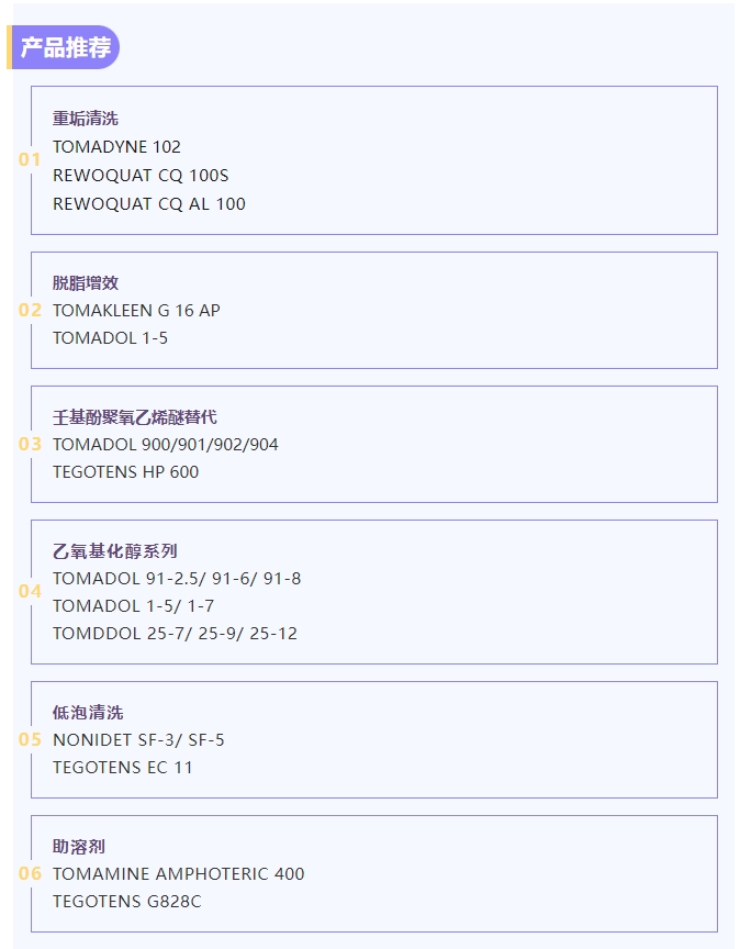 我司一直致力于表面活性剂及其下游应用的原料选用、供应以及技术解决方案提供等服务。在工业和家居清洗领域可提供全系列的表面活性剂以及特种表面活性剂,此外还可提供助溶剂、缓蚀剂、消泡剂、酶制剂等清洗助剂。以下将为大家重点介绍赢创EVONIK在工业和家居领域的产品方案,欢迎大家根据配方需求进行选用!