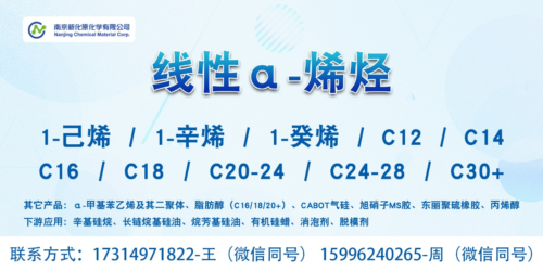 南京新化原化学致力于为有机硅行业提供优质的硅油改性剂,其中α-烯烃原材料可用于硅油的烷基化改性,下游可用于脱模剂、消泡剂、织物整理剂等。α-烯烃产品涵盖正己烯、正辛烯、C12、C14、C2024及C30+等全碳链α烯烃。供应来源于美国雪佛龙、埃克森美孚、壳牌、日本出光、沙特沙比克、俄罗斯NKNK等主流的α-烯烃生产商,货源更稳定。