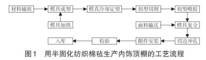 半固化纺织棉毡又称热固性纺织棉毡,属于再生纤维基材。半固化纺织棉毡的主要原材料来源于服装工业的下脚料,虽然综合性能稍差,但由于料源充足、价廉易得,曾被广泛使用,国内南汽依维柯轻型车、二汽EQ153 平头载货车、天汽TJ1041 轻型车、东南汽车戈蓝等均使用过。随着人们对乘用车的气味和VOC等散发性能关注度的提高以及车型的更新换代,这类基材逐渐被麻纤维板基材、PP基材和PU基材所取代。半固化纺织棉毡的成型物质为热固性酚醛树脂,生产过程会释放出大量的刺鼻难闻气味,造成环境污染。目前除个别低端车型或农用车使用外,很少有汽车厂家使用。虽然环氧系列等环保型棉毡也有研究,但由于顶棚有一定的刚性要求,目前环氧树脂棉毡的力学性能远不及酚醛树脂棉毡。用半固化纺织棉毡制造内饰顶棚的生产工艺流程见图1。