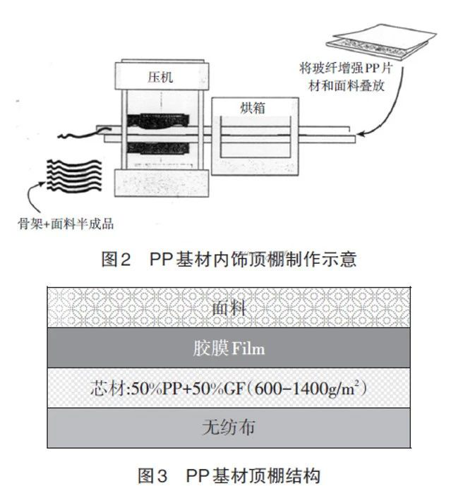 内饰顶棚用PP基材(欧洲称为轻质GMT复合材料、日韩称为KP-sheet)是以热塑性PP 为基体、以长玻璃纤维或连续纤维毡为增强材料的复合材料。湿法工艺PP基材是由发泡聚丙烯与玻璃纤维混合、脱水后、加热辊压复合而成,干法工艺PP基材是由聚丙烯纤维与玻璃纤维混合、梳理铺网、针刺、加热辊压复合而成。PP基材在200~210℃条件下加热50~120s,膨胀后被传送到内饰顶棚冷模具保压定型,保压时间20~45s,PP基材内饰顶棚制作示意图见图2,顶棚结构见图3。