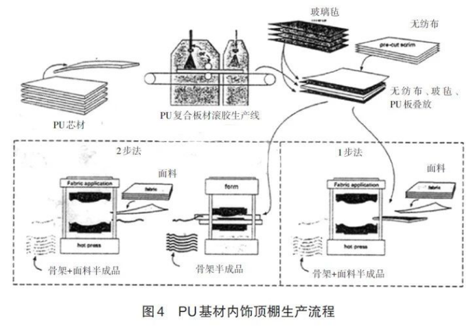 PU复合基材既有PU发泡板材的质量轻、尺寸稳定、吸音、隔热及良好的缓冲性能等优点,又具有玻纤的刚性、PU 的可塑性等优势,因此已成为内饰顶棚性价比最高的基材而被广泛使用,占据着80%左右的市场份额,其生产工艺流程见图4。