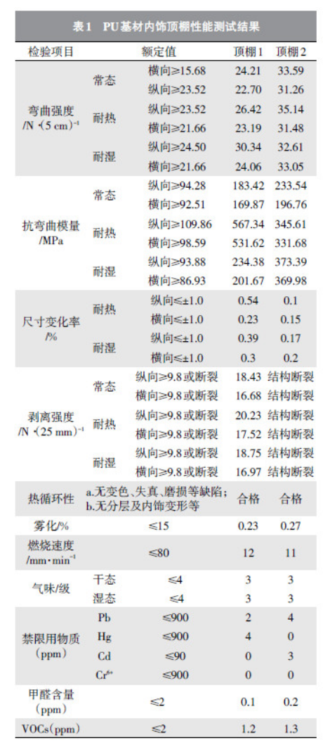 b.力学性能优良,没有明显的劣势指标,由表1 某款韩系车PU 基材内饰顶棚性能测试结果(测试方法按MS257-13)可以看出,测试的性能指标远远高于额定值。