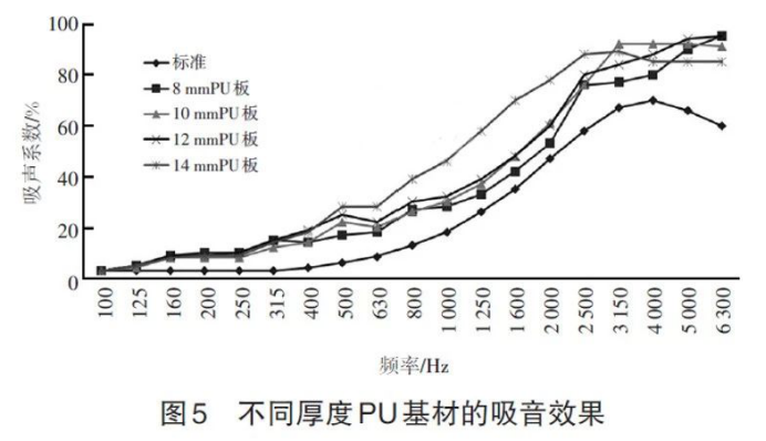 c.吸音性能超强。图5是用驻波管法检测在相同工艺条件下、用不同厚度PU板生产的内饰顶棚的吸音性能的结果,并以某款合资品牌车型的吸音标准为基础进行了分析。结果表明,PU基材内饰顶棚的吸音性能远高于产品标准要求;PU基材厚度越大,吸音效果越好。
