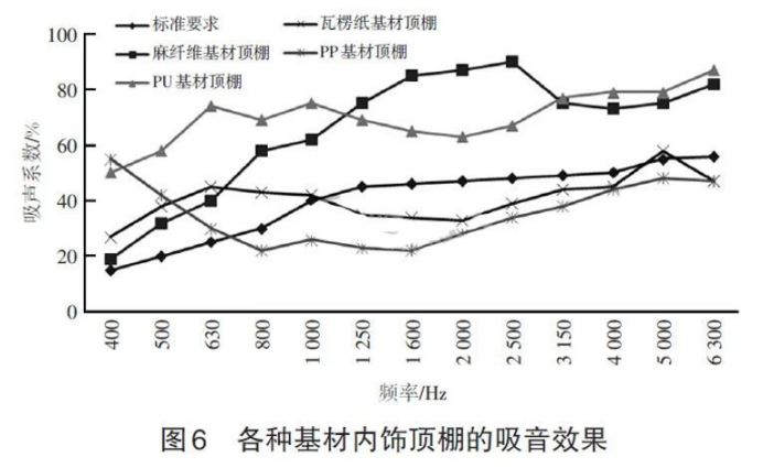 图6是用混响室法检测同等厚度、同样结构面料、不同基材生产的内饰顶棚的吸音性能结果,并以某款合资品牌车型的吸音标准为基础进行了分析。结果表明,PU基材内饰顶棚和麻纤维基材内饰顶棚的吸音性能远高于标准要求,各类基材内饰顶棚吸音性能按优劣顺序排序:PU>麻纤维>瓦楞纸板>PP。