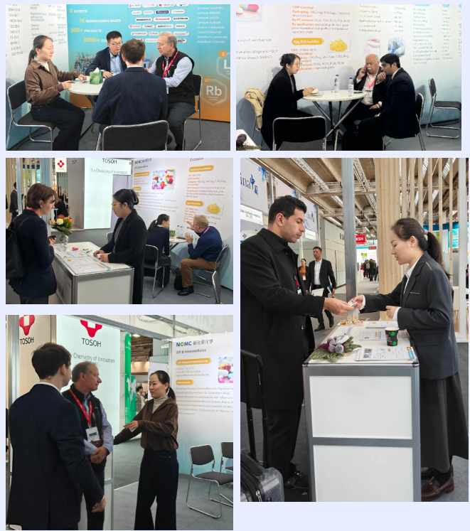 此次展会,NCMC作为参展商,再度携团队跨海出征,以亮眼姿态亮相法兰克福,不仅带来了自产的高品质碘系列、锂系列特色产品,同时也集中展示了国内优质合作工厂的其他优势产品,包括医药原料、中间体和药用辅料等,丰富的产品矩阵精准匹配不同客户的需求,吸引了大批新老客户驻足问询、深入洽谈,现场人气持续高涨。