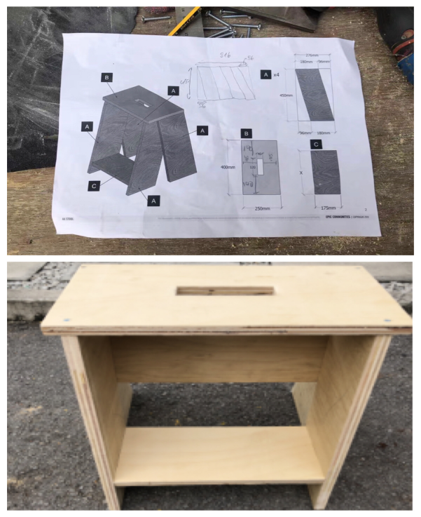 第一天所有第一次参与建筑的志愿者在EPIC提供的工作室进行正式搭建前的培训,我们被随机分成小组,然后在专业的技术人员指导下,共同合作完成一个简单的木板凳,看似简单的一张图纸,但实际需要经过精确的尺寸衡量,切割木板,钉装牢固,打磨抛光才能出成品。
