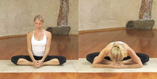 02束角式:这是一个强烈推荐女性的一个瑜伽体式,对身体有很多益处!1、坐姿准备,双腿向前伸直,屈膝,脚掌心相对;2、双手抓住双脚脚趾,让脚后跟靠近会阴处,脚的外侧自然的贴靠地面;3、背部挺直,让大腿自然的分开,膝盖靠近地面;4、眼睛注视前方,呼气,身体前屈,做到自己能承受的程度,让鼻子下巴放在垫子上,注意不能只为了头着地,背部弯曲,始终保持背部的延展;5、吸气,缓慢回到坐姿,松开双脚,放松双腿。保持3-5分钟。