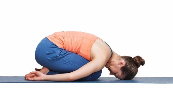 03婴儿式:跪立在垫面上,双脚并拢(亦可打开与垫面同宽),大脚趾贴靠,双腿并拢,臀部坐向脚后跟,身体前倾,腹部贴靠大腿,前额点地,脖子放松,双手自然放在身体的旁侧靠近脚后跟,亦可向前伸展手臂,掌心贴地。保持3-5分钟。