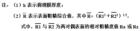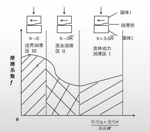 ①~③又称流体润滑。根据两对偶表面粗糙度综合值R与油膜厚度h的比值关系,可将润滑的类型区分为流体润滑、混合润滑和边界润滑。图为斯特里贝克(STRIBECK)曲线,分析了载荷、运动速度及润滑油粘度与摩擦系数之间的关系 :