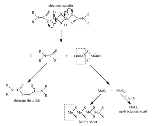 MoDTC热分解的机理:MoDTC→MOS2,有机钼通常以液态形式溶于润滑剂中,在摩擦过程中能够在摩擦表面形成具有减摩抗磨作用的物理化学吸附膜。