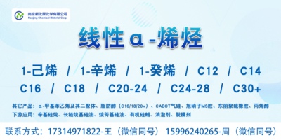 本公司致力于为有机硅行业提供优质α-烯烃原材料,产品涵盖正己烯、正辛烯、C12、C14、C2024及C30+等全碳链α烯烃,除了可用于硅油的烷基化改性,还可用于辛基三乙氧基硅烷以及日化有机硅蜡的生产。供应来源于美国雪佛龙、埃克森美孚、壳牌、日本出光、沙特沙比克、俄罗斯NKNK等主流的α-烯烃生产商,货源更稳定。