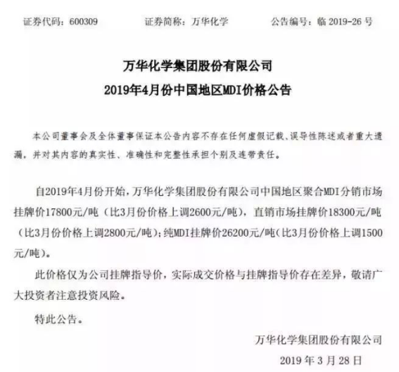 3月28日,万华化学4月份聚合MDI价格将再次大幅上调。本次万华化学中国地区聚合MDI分销市场挂牌价17800元/吨(比3月份价格上调2600元/吨),直销市场挂牌价18300元/吨(比3月份价格上调2800元/吨);纯MDI挂牌价26200元/吨(比3月份价格上调1500元/吨)。这是自2019年开年以来,万华化学MDI第三次涨价。