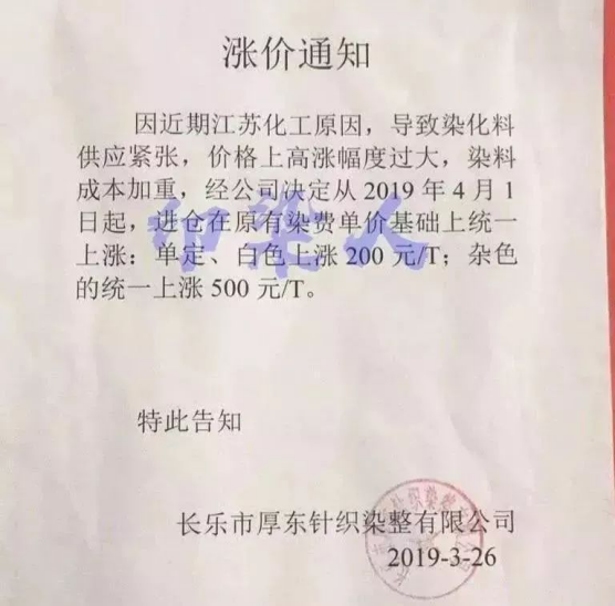 染料企业掀起涨价潮,广东、福建、浙江连发7份染费涨价通知。
