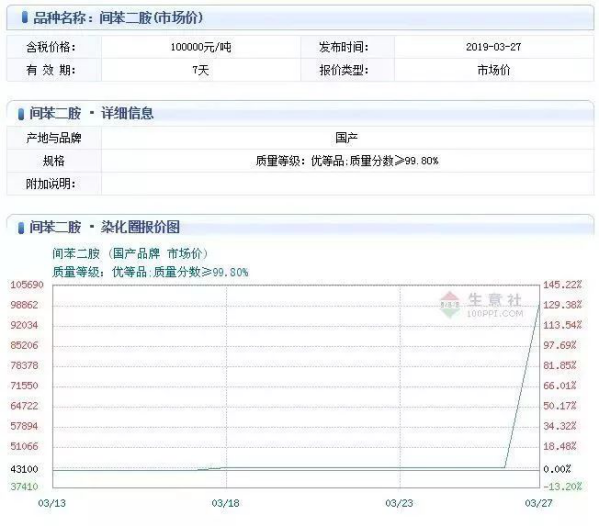 统计显示,3月27日国产间苯二胺的报价已达到约10万元/吨。3月27日,浙江龙盛集团股份有限公司发布公告称,3月21日下午发生爆炸的江苏天嘉宜化工有限公司,拥有间苯二胺年产能1万吨,是行业内仅次于浙江龙盛的第二大核心生产工厂。此次爆炸事件将影响间苯二胺约25%的市场容量,直接导致供应短缺、价格上涨。