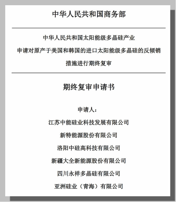 重磅!多家硅企递交申请!商务部对原产于美、韩的进口太阳能级多晶硅继续实施反倾销措施!