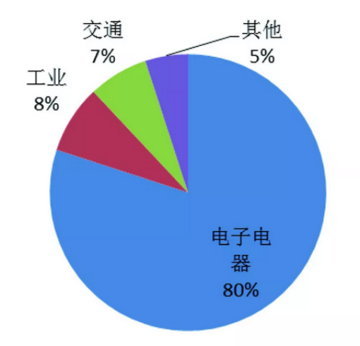 在全球范围内,2017年TLCPs的消费量约为3.9万吨,亚洲地区是最大的消费市场,占据了全球80%以上的市场份额。其中中国占据50%以上的市场;其次是日本,约占20%的市场;美国大约占10%的市场份额。最初,TLCPs主要用于微波炉或其他炉具,而如今从产品应用上看,电子电器、工业、交通领域分别占据80%、8%和7%。全球TLCPs消费结构见图1。